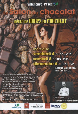 28. février 2016 Salon du chocolat 2016 Esapace concorde 4,5 zr 6 Mars 2016 Vendredi 4 mars de 15h à 20h 19h15 inauguration 19h30 défilé de mode Samedi 5 2016 de 10h à 20h 11h45/14h30/18h défilé de mode Dimanche 6 mars de 10h à 19h 11h45/14h30/18h défilé de mode tagPlaceholderCatégories : Écrire commentaire Commentaires: 0